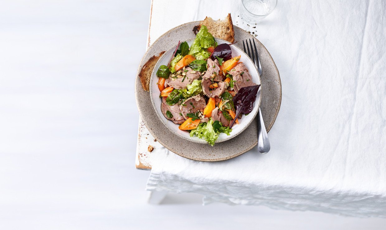 Kalbsfilet in sehr dünne Scheiben schneiden, auf den Salat geben und servieren.